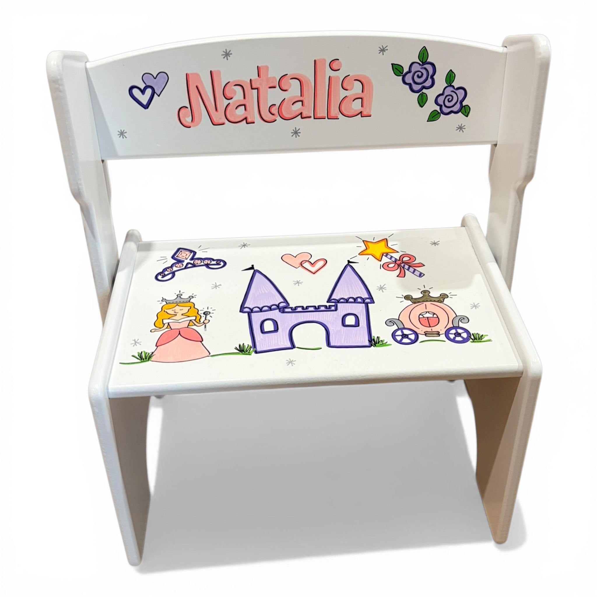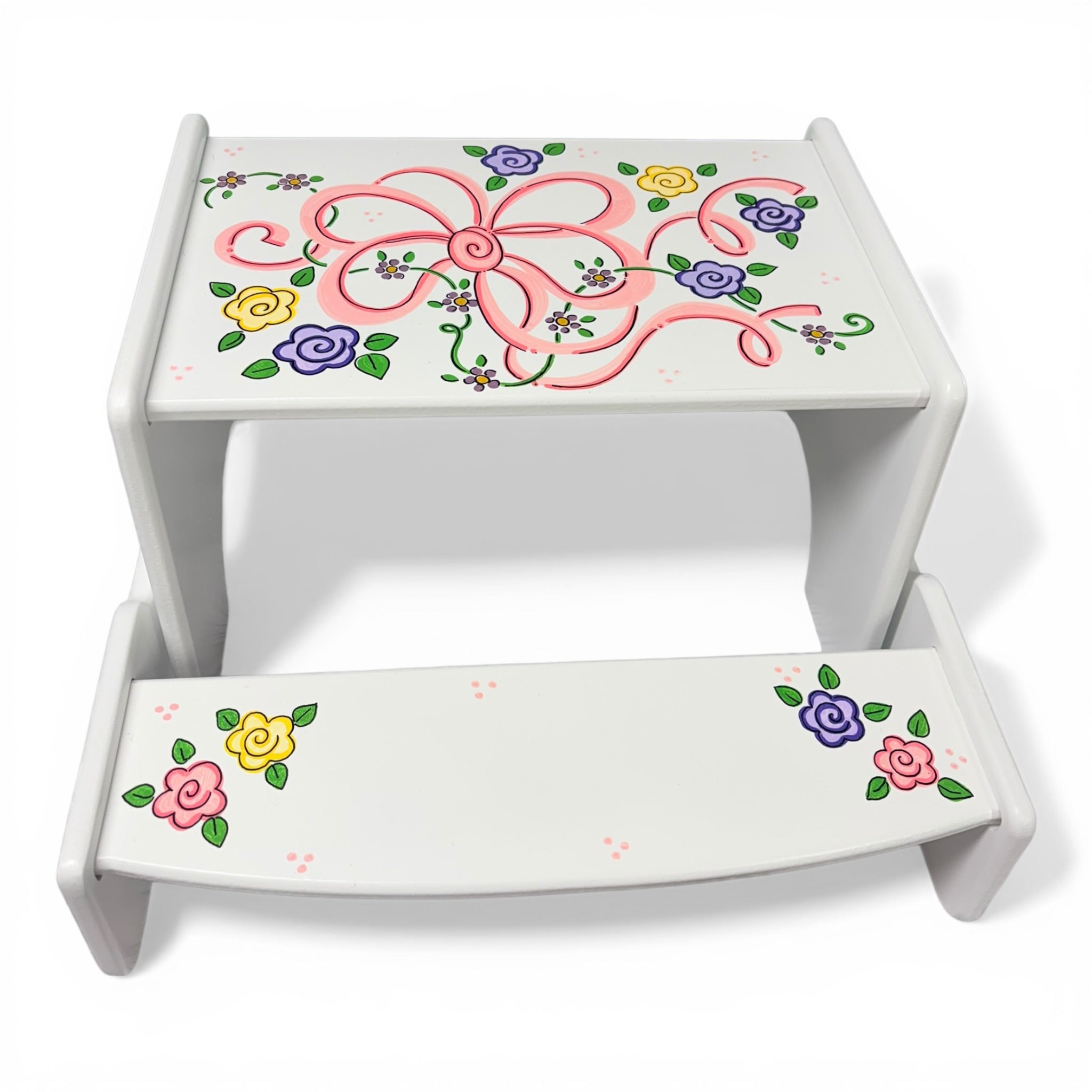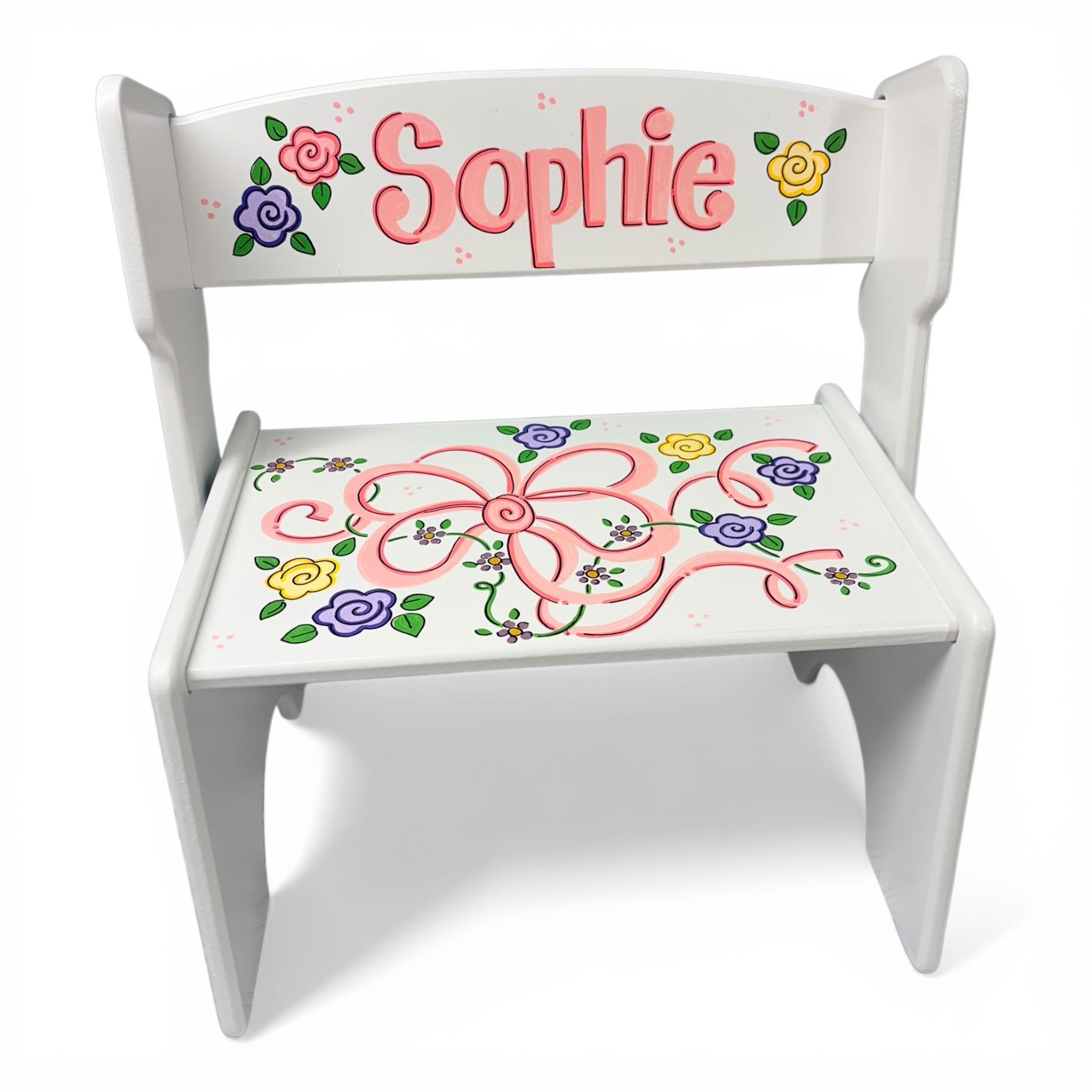 Select one of our hand painted designs and personalize with the child's name, this fun and functional stool makes the perfect gift! Whispy Ribbon Design pictured.