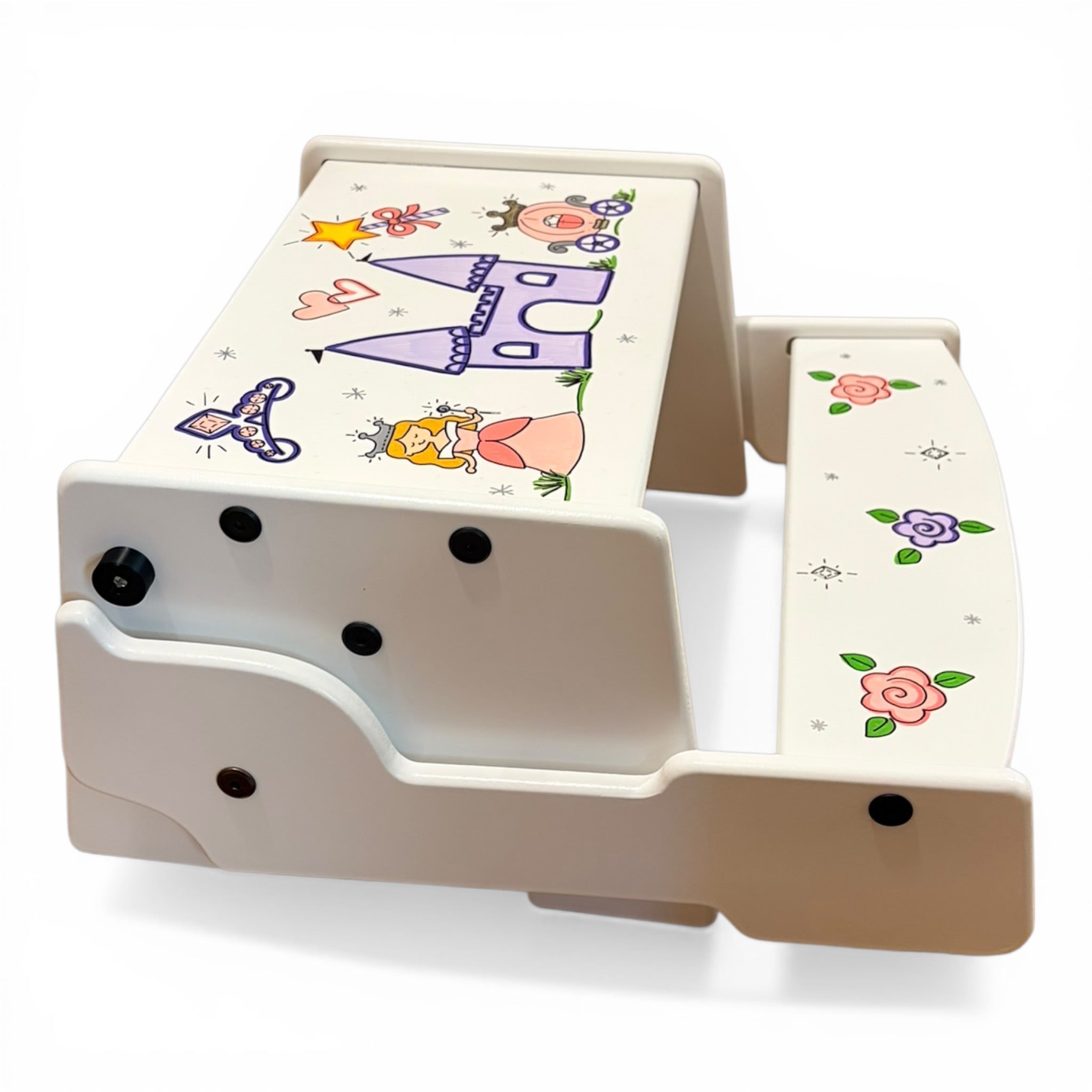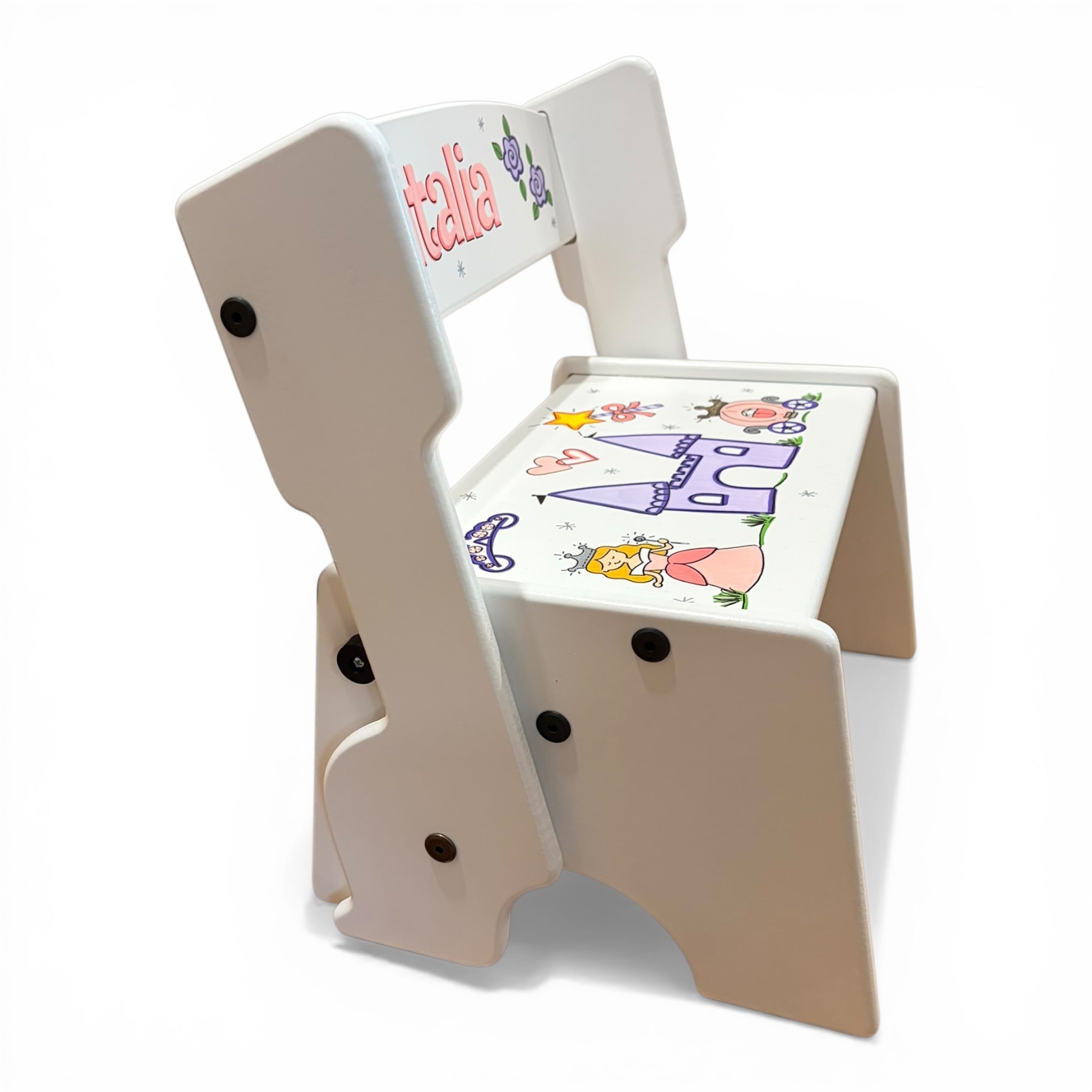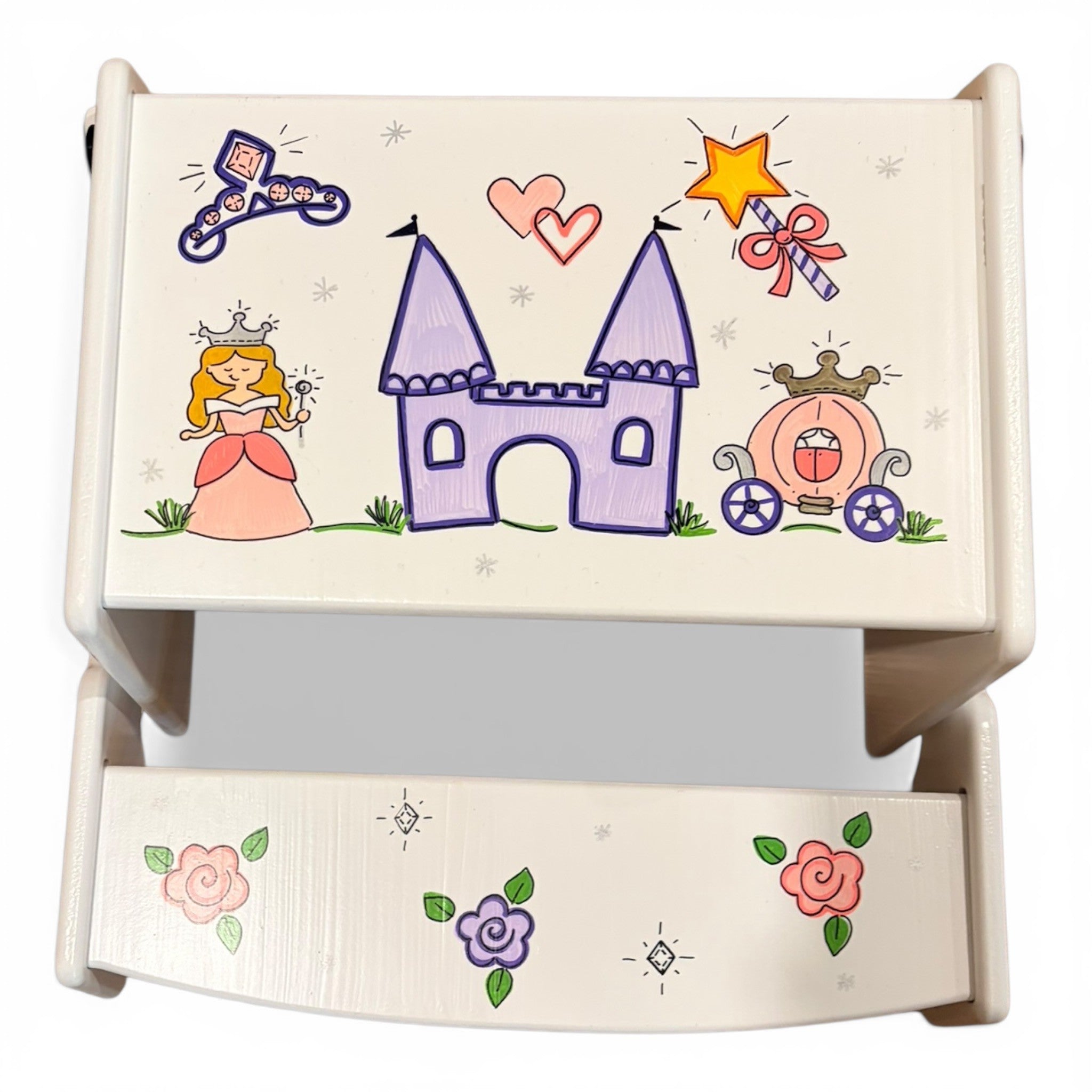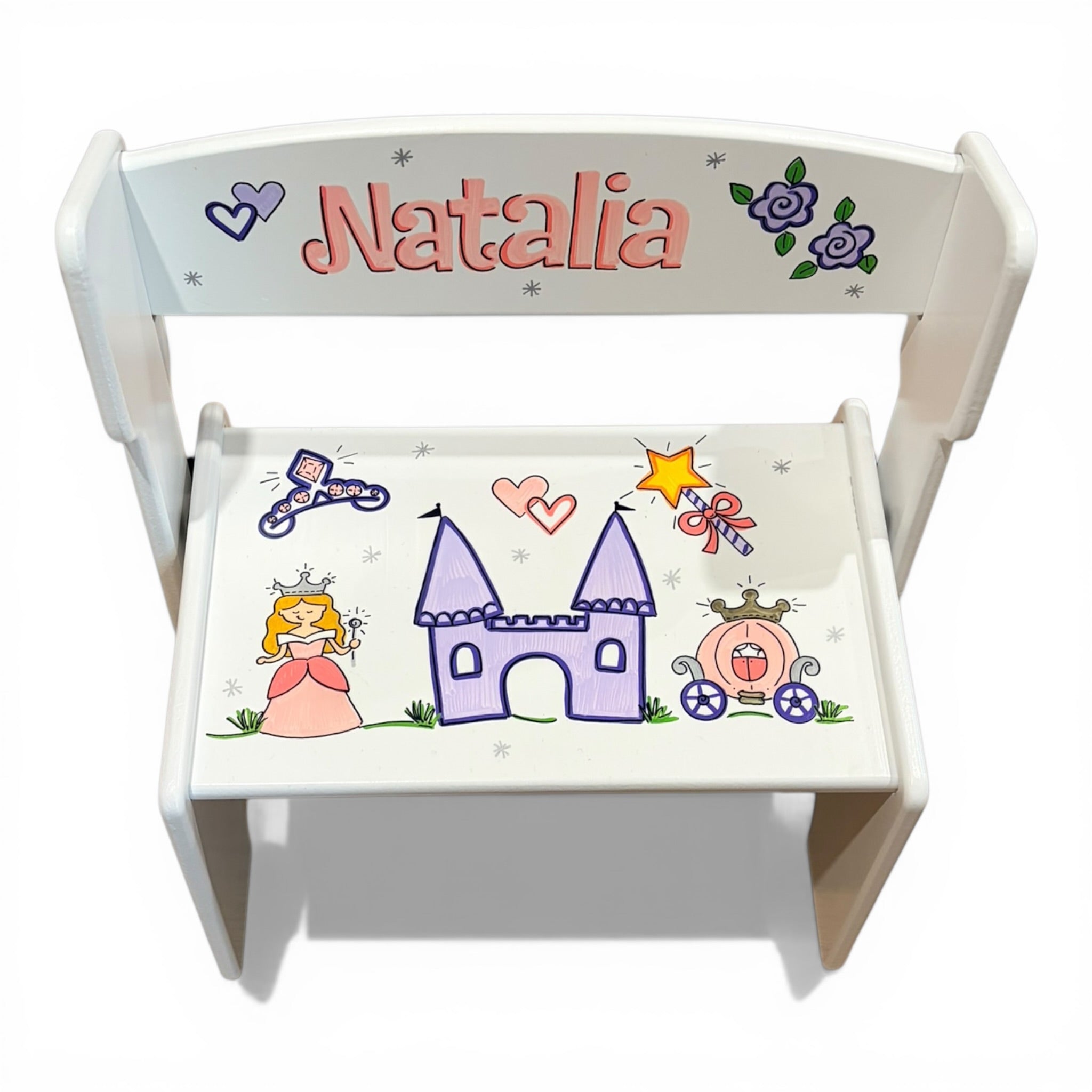 Select one of our hand painted designs and personalize with the child's name, this fun and functional stool makes the perfect gift! Whispy Ribbon Design pictured.